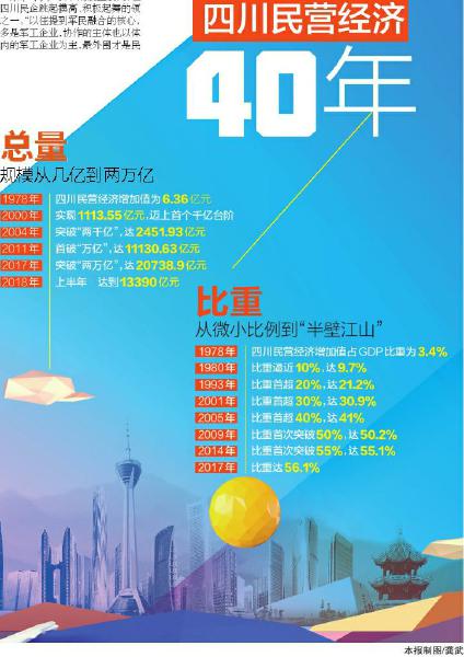 另一條上升曲線,更直觀勾畫出四川民營經(jīng)濟40年的強勁發(fā)展態(tài)勢:1978年,四川民營經(jīng)濟增加值占GDP比重僅為3.4%;2017年占比已飆升至56.1%。民營經(jīng)濟地位逐年提高,撐起“半邊天”。