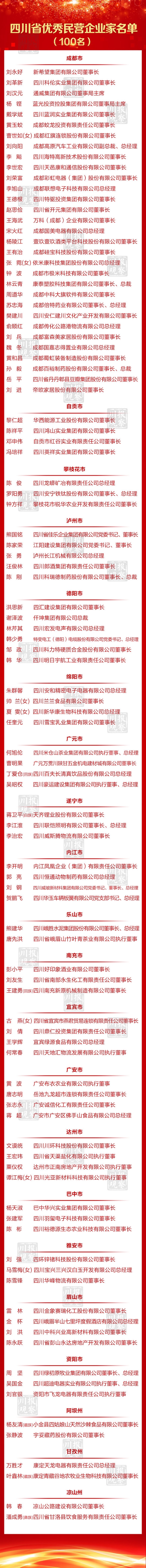 為營(yíng)造激勵(lì)企業(yè)家干事創(chuàng)業(yè)的社會(huì)氛圍,推動(dòng)全省民營(yíng)經(jīng)濟(jì)健康發(fā)展,11月20日,四川省民營(yíng)經(jīng)濟(jì)健康發(fā)展大會(huì)發(fā)布“雙百”榜單,對(duì)四川省100名優(yōu)秀民營(yíng)企業(yè)家和100戶優(yōu)秀民營(yíng)企業(yè)進(jìn)行表彰。