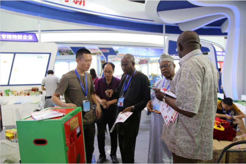 尼日利來采購商在井研飛來機(jī)械制造有限公司展區(qū)現(xiàn)場洽談采購業(yè)務(wù)。