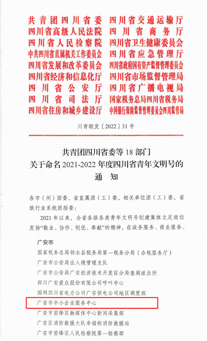 近日,在共青團(tuán)四川省委等18部門發(fā)布的《關(guān)于命名2021—2022年度四川省青年文明號的通知》中,廣安市中小企業(yè)服務(wù)中心被授予“四川省青年文明號”榮譽(yù)稱號。