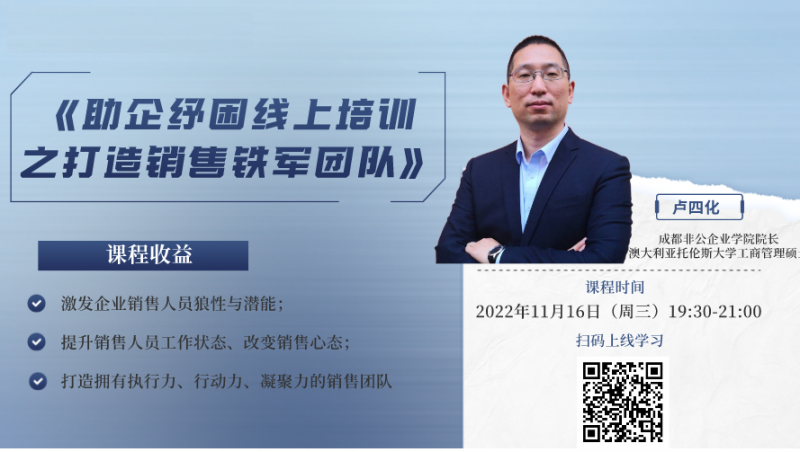 11月16日,我中心開展了《助企紓困線上培訓(xùn)之打造銷售鐵軍團(tuán)隊(duì)》。強(qiáng)實(shí)新材料有限公司、福斯特液壓、恒信達(dá)機(jī)電等專精特新企業(yè)在內(nèi)的50余家企業(yè)近1100人次上線學(xué)習(xí)。