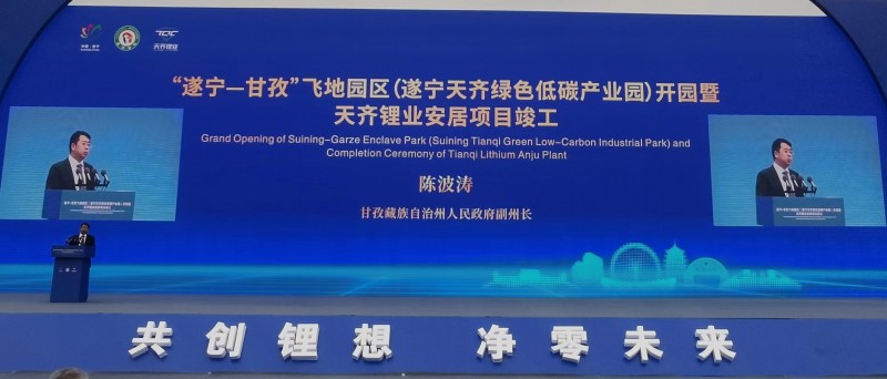 10月26日,“遂寧-甘孜”飛地園區(qū)開園掛牌儀式在遂寧市安居經(jīng)開區(qū)天齊鋰業(yè)2萬噸碳酸鋰項目現(xiàn)場舉行。四川省人大常委會副主任何禮,澳大利亞駐成都總領(lǐng)事館總領(lǐng)事倪瑞蘭,中國有色金屬工業(yè)協(xié)會副秘書長、鋰業(yè)分會會長李宇圣,遂寧市人大常委會主任周霖臨,遂寧市委常委、常務(wù)副市長江彬,遂寧市政府副市長許文強(qiáng),甘孜州政府副州長陳波濤,天齊鋰業(yè)股份有限公司董事長蔣衛(wèi)平,天齊鋰業(yè)股份有限公司總裁夏浚誠出席儀式。