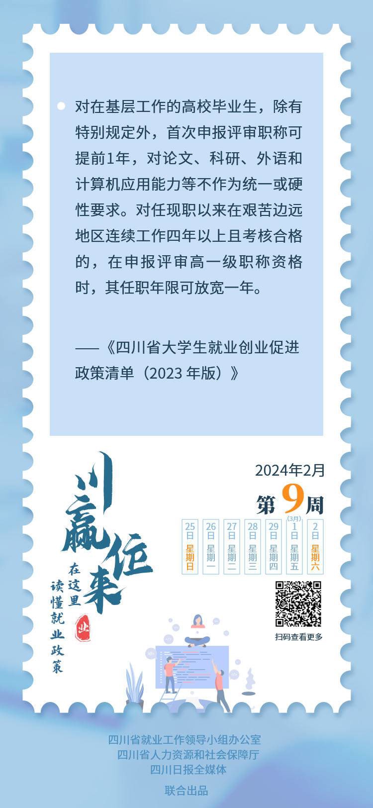 為引導(dǎo)和鼓勵(lì)高校畢業(yè)生到基層就業(yè),優(yōu)化服務(wù)保障,為高校畢業(yè)生在基層成長成才創(chuàng)造良好條件,近年來國家和省先后出臺(tái)多項(xiàng)優(yōu)惠政策。由省就業(yè)工作領(lǐng)導(dǎo)小組辦公室會(huì)同省級(jí)相關(guān)部門匯總編輯的《四川省大學(xué)生就業(yè)創(chuàng)業(yè)促進(jìn)政策清單(2023年版)》,對(duì)這些優(yōu)惠政策進(jìn)行了梳理。本期“川贏位來·就業(yè)政策周歷”,我們一起來分享這些相關(guān)政策。