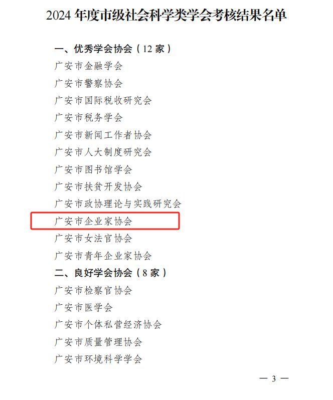 近期,市社科聯(lián)對市屬社科類學會(協(xié)會、研究會)2024年度工作情況進行綜合目標考核,經(jīng)申報自評、復核評估、市社科聯(lián)黨組會議審定,廣安市金融學會等12 家學會協(xié)會考核等次為優(yōu)秀,廣安市檢察官協(xié)會等8家學會協(xié)會考核等次為良好,其中廣安市企業(yè)家協(xié)會榜上有名,連續(xù)兩年獲得優(yōu)秀協(xié)會。